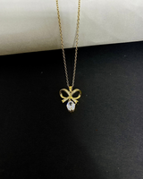 Crafted from gold-tone stainless steel, the pendant features a bow-shaped silhouette with a radiant clear crystal at the center. Its polished finish reflects light beautifully, while the design speaks to moments of love, femininity, and celebration.