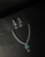 • A regal choker-style necklace with a striking square emerald centerpiece, framed by dense layers of encrusted micro-crystals.
